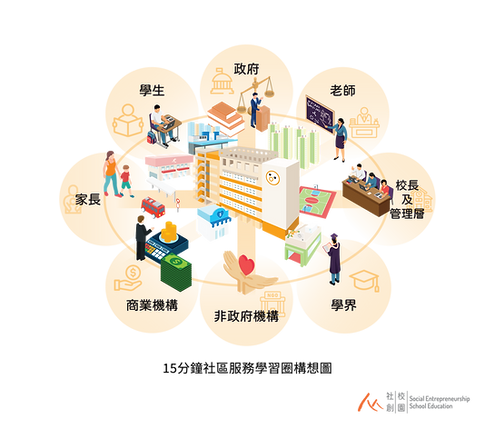 以學校為中心,建立社區服務學習圈。透過連結不同合作夥伴,包括結合政、商、社、民、學等多方資源,成為學校的協作夥伴及贊助商,共同建立15分鐘社區服務圈及校本跨界支援網絡。